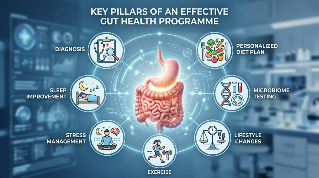 Many gut health programmes available today focus only on diet plans or supplements. However, gut health is influenced by several factors including diet, lifestyle, stress, sleep, microbiome balance, and underlying medical conditions.