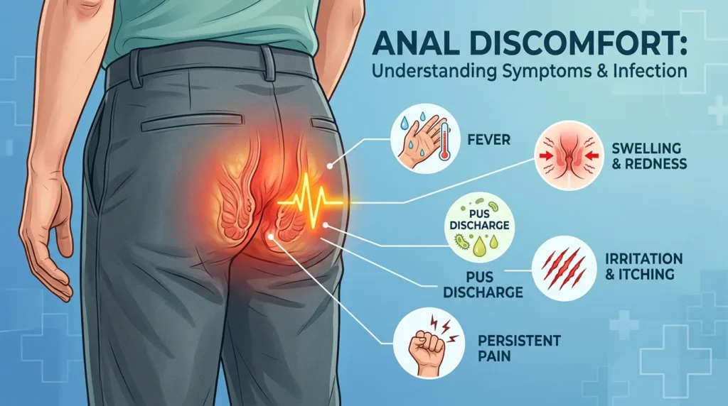 Common symptoms include pain, swelling, pus discharge, irritation around the anus, and recurrent infections or abscess formation.