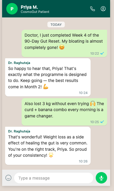 Doctor my weight has come down 8 kgs in 3 months with your gut health program! Feeling more energetic than ever. My wife also wants to consult you now 😄